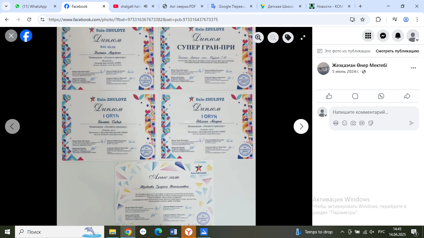 - Жетекшісі Жузбаева Гулдана Жангалиевнаға 30000 теңге сыйақы және байқауға шәкірт дайындап,белсенділік танытқаны үшін алғыс хат берілді.