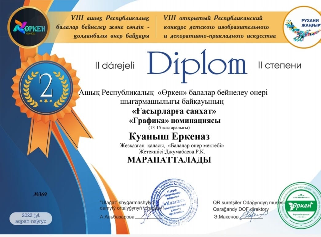 Еркеназ Куаныш, 2 класс преподавателя Джумабаевой Рубины Кашкынбаевны нарисовала основные этапы развития Казахстана в образе Путешествия по смартфону в технике тонированной бумаги и карандашей. Еркеназ заняла 2 место.
